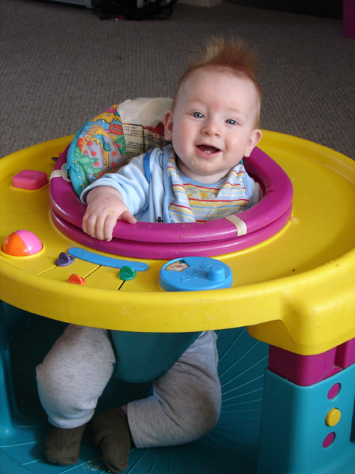 Here’s some pictures of him today. He somehow worked his seat loose from the saucer and when I looked over at him he was all but disappearing into the seat. We are quickly approaching the stage of constant vigilance! (In the second picture he is making his signature screaming sound.)