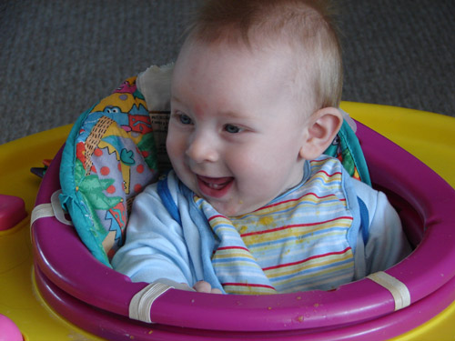 He is getting much more mobile, though not crawling yet. He’ll readily get down from a sitting position onto his back or stomach, and is rolling more frequently onto his stomach from his back. He also has figured out how to get back to his back, though he doesn’t do that as often. He walks himself around in a circle on his hands as well, so with these combinations of movements he can move a couple feet of distance and face about any direction he wants. It is fun to see where he ends up now when I put him down, but also means my floors need to remain a little bit cleaner as he is also beginning to develop more finger control of small hard to see objects. 🙂