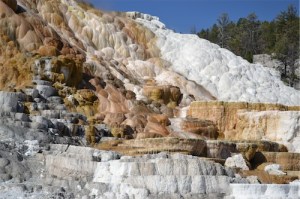 mammoth_springs2 July 26, 2012 ~ miriamlein The different colors are made by different micro-organisms that all live in slightly different temperatures.