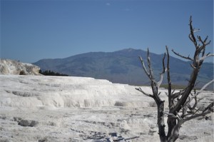 mammoth_springs4 July 26, 2012 ~ miriamlein It looks like ice, but it is all deposits from the hot springs, and you can’t walk on it, because some spots are pretty thin and if you break through you will fall into steaming hot water.