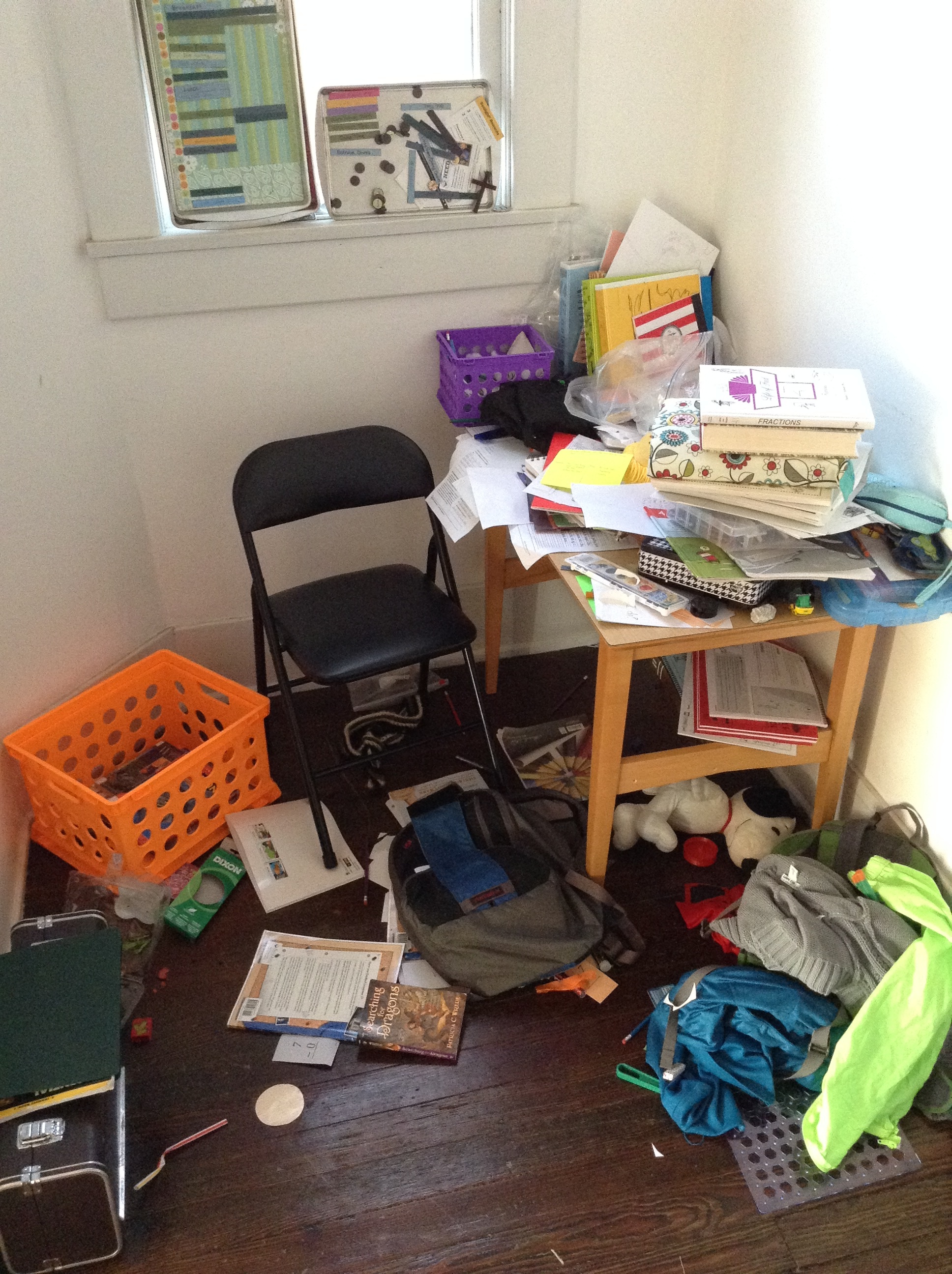 After maneuvering the drop off line, I headed the van towards John’s work. We have only one car right now, and today John needed a ride to work. It was just a few minutes after 8 when I dropped him off, so it is good to know that this is a viable option for days when we need to do it this way. I swung by my grandparents duplex to drop off the food and then headed home. The boys eagerly finished their breakfasts while I washed up the dishes. Will also was helpful enough to bring the trash can back from the road where it has been sitting since Monday morning. He tried to be creative though, and brought it to the front porch instead of the back porch. I’m not sure we’ll leave it there, but for now, I let it slide. IMG_0724Once the dishes were washed up, I got together the boys’ math books, inwardly sighing at my school corner, which currently resembled a trash dump, and got Dietrich his second breakfast. This, I have discovered is the only way to make it through math time without a very loud, whiny toddler. The boys have been playing on the front porch, so I called them in for math, only to discover Seth inside the trash can under Will’s apparent encouragement. Oh well, one more thing to add to my list of things I never imagined saying to my kids: “Get out of the trash can!”