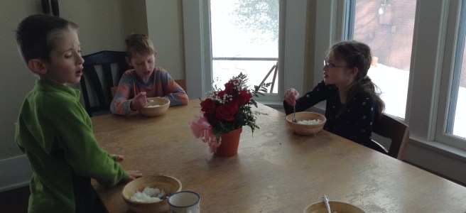 We enjoyed a fun morning playing with friends. I even got a good mom chat in between refereeing the kids play and comforting kids when they came running in tears for minor scrapes and bruises. We had to leave promptly at 11:30 to go get John from work so he could make it to a lunch appointment and have the car for the rest of the day. He dropped us off at home at around 11:45. Everyone was hungry, but I needed to warm up the already made food. Dietrich was making his hungry whine, so I gave him a pita bread with butter and honey and a glass of milk to keep him happy until the egg casserole was done. There was a loud altercation going on in the living room between Elise and the boys. It turned out that they were “destroying” the couch, something they do often to build houses or make piles of cushions to sit on, and it drives Elise crazy. I don’t like it much myself, and so I had told them just a couple days ago that they were not allowed to do this unless they asked my permission first, so this is what I reminded them of as I started putting the cushions back. “Mom,” Will pipes up, “Can we destroy the couch?” “No!” I answer before sending both him and Will to play outside until lunch. I did some computer stuff, mainly typing this I think, while I waited, checking every so often on the food. Dietrich finished his whole pita and all his milk pretty quickly, so I scooped out some slightly warm casserole for him. He also wanted more to drink, so I gave him some water. Within a few minutes, the water had ended up in his bowl and all over his tray, so I decided that meant he was done. He got wiped up and put down and I started getting the other kids’ food ready.
